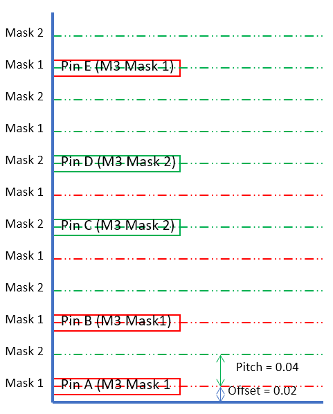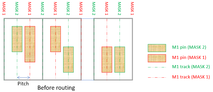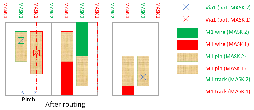 The above diagram shows three standard cells and in each standard cell, each pin has its own mask number. Let us assume all the standard cells in this design are manually placed in Virtuoso and the cell view is loaded into Innovus. If the offset, pitch and mask pattern are specified correctly, the router in Innovus can add wires or vias with the right mask number and at the right location to access the pin easily as shown in the diagram below.