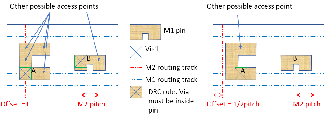 As an example, consider the image on the left below. If the right track pattern is created, there are five possible access points for the router to insert a via for Pin A and two possible access points for Pin B. However, if the offset is not specified correctly, resulting in the generation of poorly located routing tracks, the router would find less preferable locations to access the pins. Though it is possible to create an off-grid wire, the router either needs to spend more time to find a good solution or settle for a less optimal quality of result.
