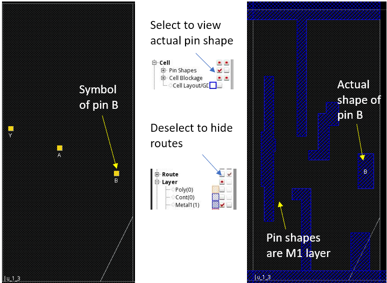 By default, Innovus does not display the pin shape of a standard cell. The yellow square(s) inside the standard cell is not a real physical object but just a symbol to indicate that there is an I/O pin. To view the actual pin shapes, select the Visibility check box of Pin Shapes on the control panel. Make sure the Visibility check box of the metal layer that the I/O pins use is also selected . For example, Visibility check box of Metal1 should be selected if the pin is of layer Metal1. If the design is routed, deselect the Visibility check box of Route so that the wires are hidden and the pin shapes can be seen more clearly.