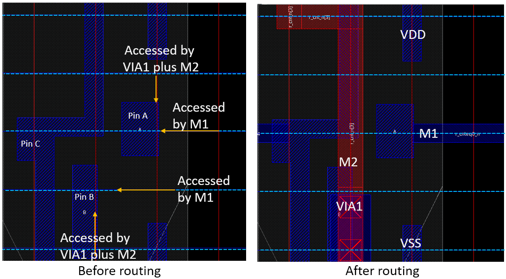 Consider the 'Before routing' image on the left hand side below. Pin B and Pin A can be accessed by the M1 wire or the VIA1 via with the routing tracks (blue dashed lines) generated at right locations. The image on the right shows one possible routing result. The router connects Pin B through VIA1 and the M2 wire and connects Pin A with the M1 wire.