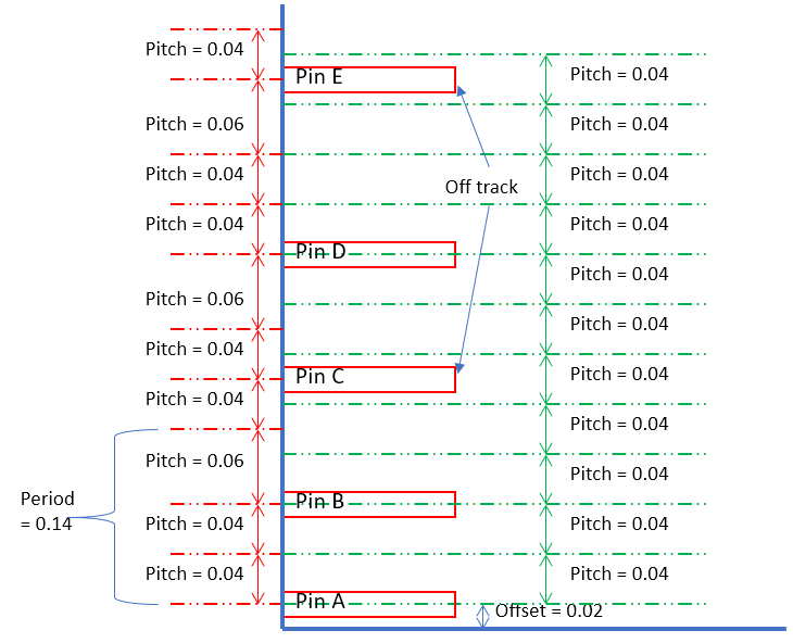 In lower technology nodes, the designer may prefer a routing track pattern of non-uniform pitch. For example, suppose that the M4 metal routing layer has a vertical preferred routing direction and its routing track is desired to be a repeated pattern of four tracks with default wire width (specified in Tech LEF/LefDefaultRouteSpec) and non-uniform spacing values as shown in diagram below. The equivalent command in Innovus is: