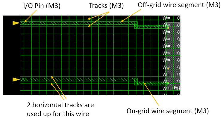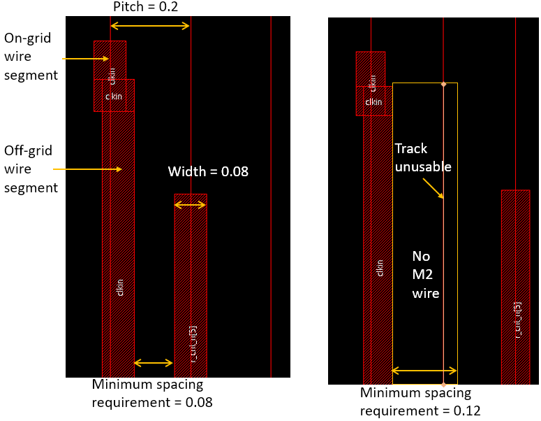 However, on certain technology nodes, it is possible that the minimum spacing requirement is the exact difference between the pitch and the wire width (0.12um in the case above). As a result, any off-grid M2 wire segment will make the area bounded by the orange box shown in the image on the right above unusable for the creation of an M2 wire. The router will not be able to use that portion of the M2 track for connections to other pins. Under such conditions, especially in a highly-dense design, the alignment of routing tracks with I/O pins and standard-cell pins becomes critical. This will be explained in detail in subsequent sections.