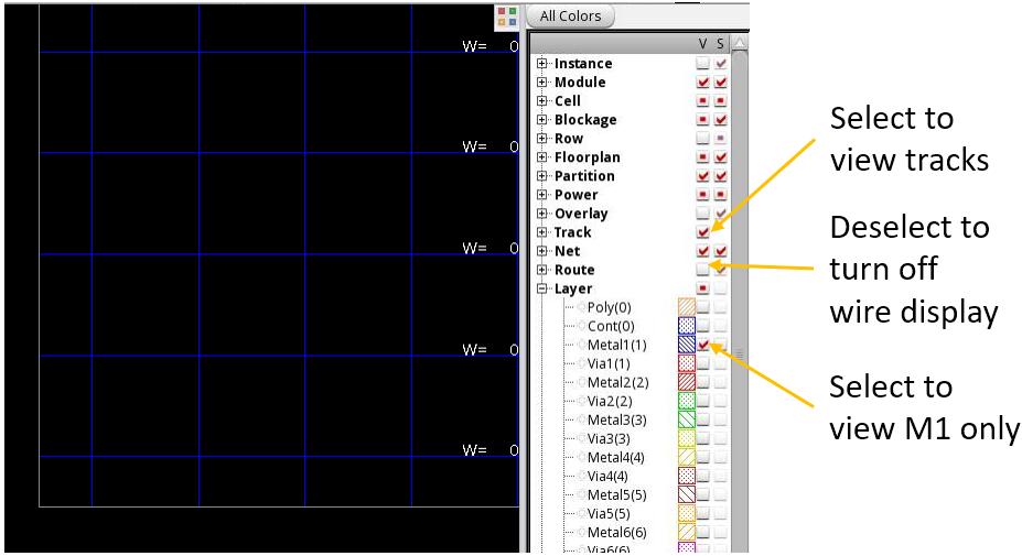 To view the tracks better, you may deselect the Visibility check boxes of other object types, such as Instance, Route, and Row. You can also turn off other routing layers. For example, turn off any layers other than M1 if only M1 routing grid is to be viewed.