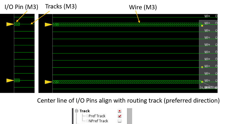 Alignment of routing tracks with the I/O pins of the design or the standard cells are critical, especially in smaller nodes. Improper alignment may result in bad quality of result. Refer to the Track Alignment in Innovus section for more information on aligning tracks with other objects, such as the I/O pins of design and cells.