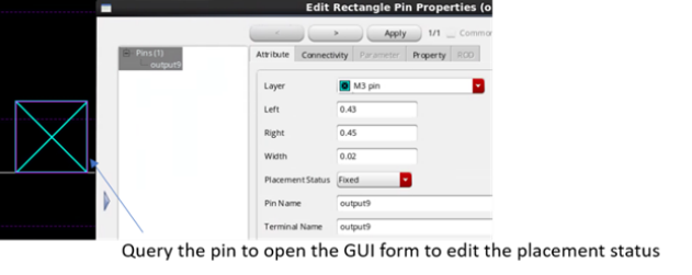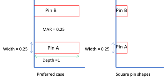 It is recommended to update the placement attribute of I/O pins toFixed(Locked/Coveris fine too) if no adjustment of the placement location is to be done in Innovus orPlacedif adjustment is expected. - For I/O pins created in Virtuoso, it is recommended that the depth of the pin shapes should be large enough to meet the minimum area rule (MAR), if such a rule exists. In most cases, the router in Innovus can add wires to increase the depth of pin shapes to meet the minimum area rule during the detailed routing of the whole design. However, ensuring that the pin shapes have appropriate depth upfront will ease the burden on the router and may prevent creation of DRC violations in corner cases.