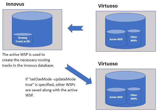setOaxMode is an Innovus command that controls the behavior of the Innovus tool when run in the OpenAccess mode. One of the options for this command is -updateMode false | true | auto. setOaxMode -updateMode is set to true, Innovus retains and writes back all custom objects, such as Fig-groups, Modegen cells, and so on. Therefore, if a design containing such custom objects is brought into Innovus for modifications, it would be best to set -updateMode to true.setOaxMode -updateMode is set to false, Innovus ignores the custom objects in the design. This mode is typically used when working on a digital block of a mixed signal design, where the implementation is being done using Innovus. In this situation, there are no custom objects that Innovus needs to retain.setOaxMode -updateMode true if you wish to retain the non-active WSPs as part of the design. Similarly, if WSP regions or WSP families are to be preserved in the round trip to Innovus, setOaxMode -updateMode true is required. Innovus will not recognize either of these WSP types, but will retain the information and send it back to Virtuoso.