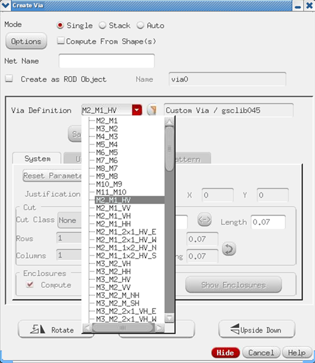 The Create Via form now displays all the vias in the ValidVia list of the LDRS from the gsclib045 tech file.