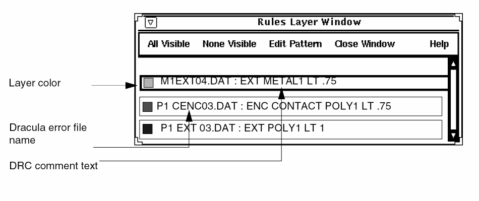 The Rules Layer Window lets you select the Dracula error file that contains the DRC errors you want to see. The following figure shows a sample Rules Layer Window.