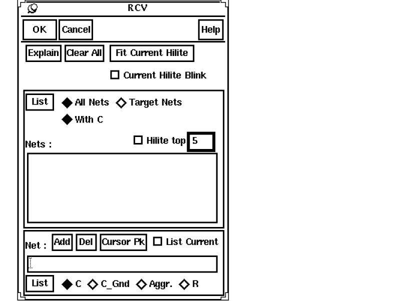 The Resistance and Capacitance Viewing window (RCV) lets you access the parasitic resistance and capacitance display capabilities in the layout window.