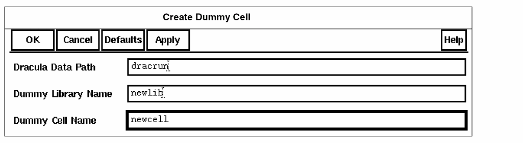 Dummy Cell Name is the name you choose for a dummy cell in the dummy library. This cell will have the attributes of the master cell in the Dracula directory you specified.