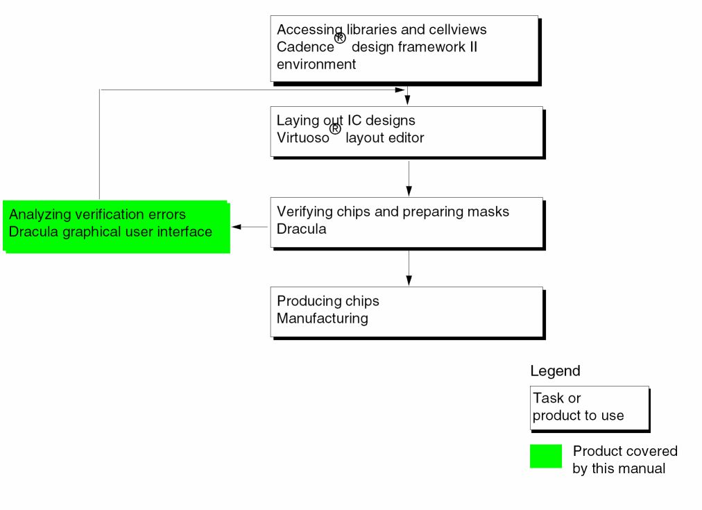 The following chart shows the flow of tasks in the verification process and the product you use for each task. This manual covers the Dracula graphical user interface only.