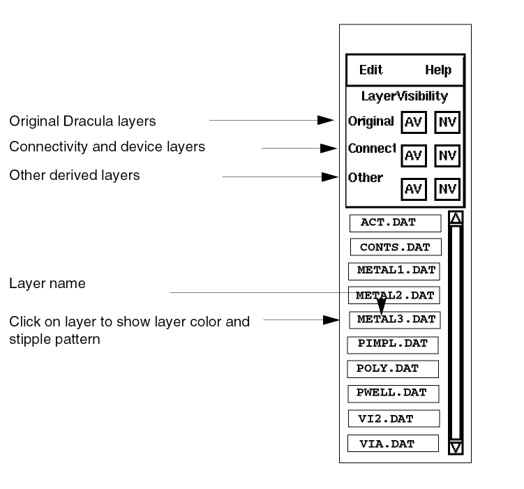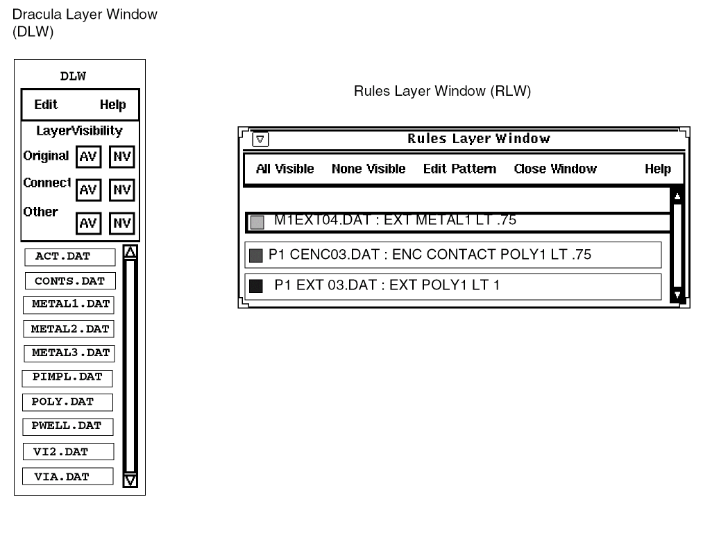 To control which Dracula layers to display in the graphical user interface window, use the Dracula Layers Window (DLW). The following figure shows a sample DLW.