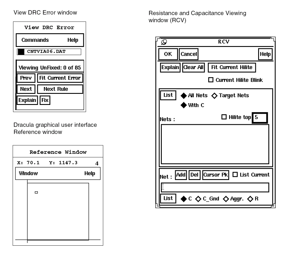 After you run Setup, the Dracula graphical user interface displays several windows that let you control how to display verification errors and parasitic data.