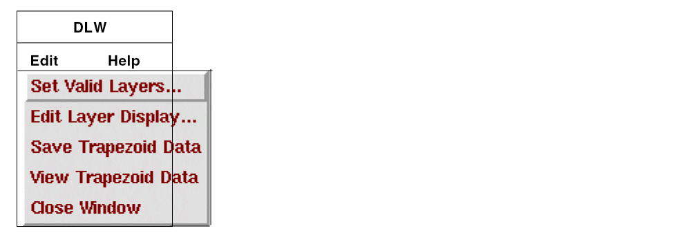 Select Layer lets you select layers which you want to be displayed and put in the DLW window. Selecting this menu item displays lists of layers in alphabetic order. The first 200 layers are listed in the first menu. If there are more than 200 layers, the remaining layers are listed in the second menu. The layer you choose is listed in the DLW and displayed in the graphical user interface design window.