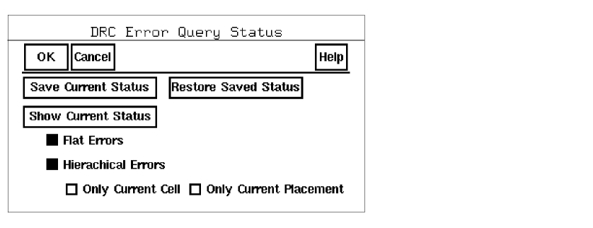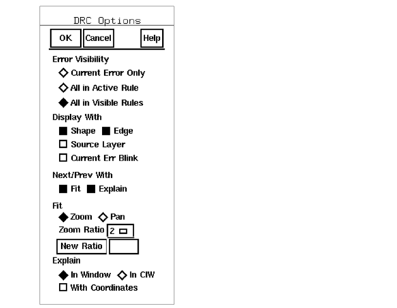 Many of the DRC options take effect as soon as you click on them. To control how errors appear in the graphical user interface design window, you can leave the DRC Options form on your screen and experiment with the different options.