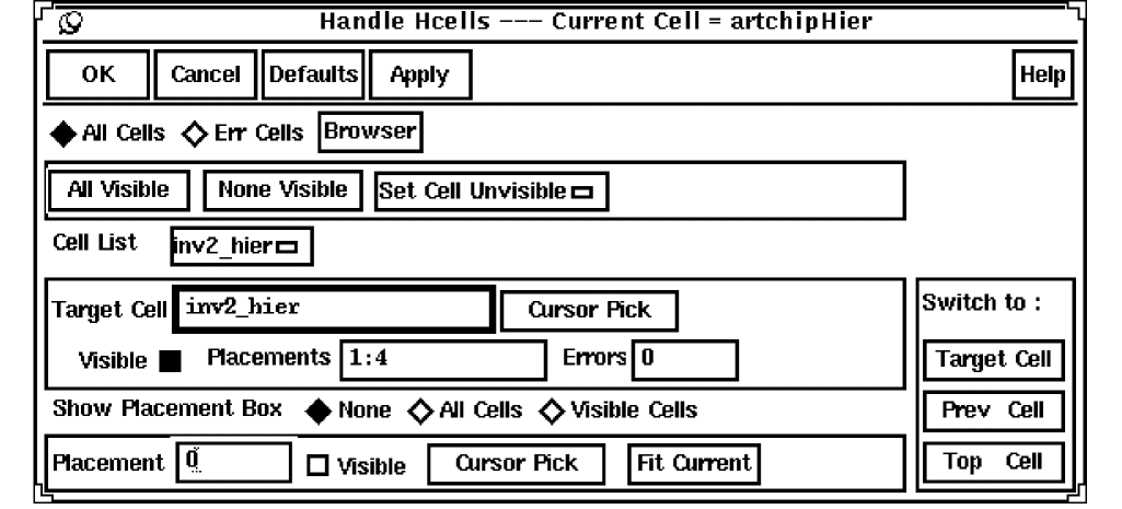 Placement lets you specify an Hcell placement number. This option is useful if you want to display a specific Hcell instance. You can type in a placement number or use the Cursor Pick button to fill in the Placement field.