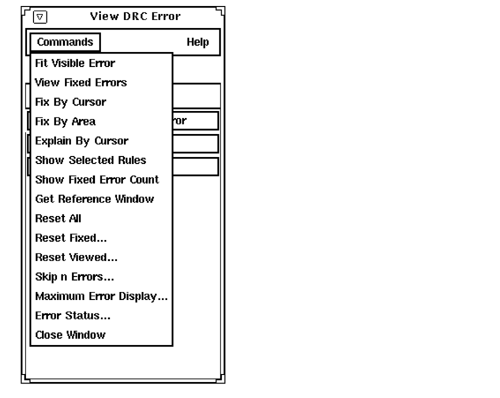 The View DRC Error Window commands let you control how to display DRC errors in the graphical user interface design window. The menu contains the following commands.