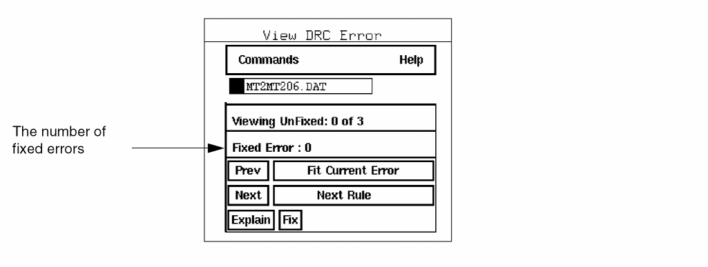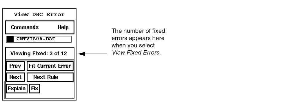 This is the default in the Commands menu of the View DRC Error window. View Fixed Errors displays the DRC errors you marked as fixed in the graphical user interface design window. The View DRC Error window shows the number of fixed errors that you are viewing. See the following example.