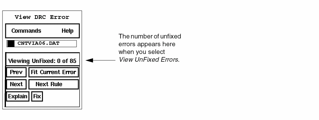 Appears in the Commands menu after you select View Fixed Errors. View UnFixed Errors displays the DRC errors you marked as unfixed in the graphical user interface design window. The View DRC Error window shows the number of unfixed errors that you are viewing. See the following example.