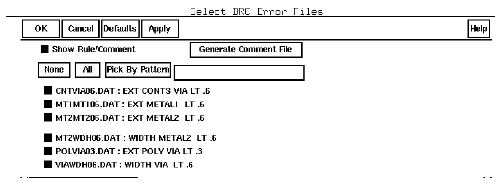 creates a new drc.comment file in the Dracula directory and overwrites the existing drc.comment file. To add comments to the drc.comment file, read the file in a text editor and add the comments that you want to appear in the Select DRC Error Files form. Click the Show Rule/Comment option off and then on again to display the new comments in the form.