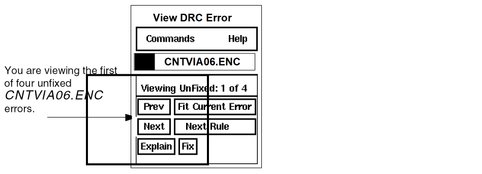 The graphical user interface window zooms in to the next error in the current Hcell. Notice that the View DRC Error form shows that you are now viewing the second of four unfixed CNTVIA06.ENC errors.