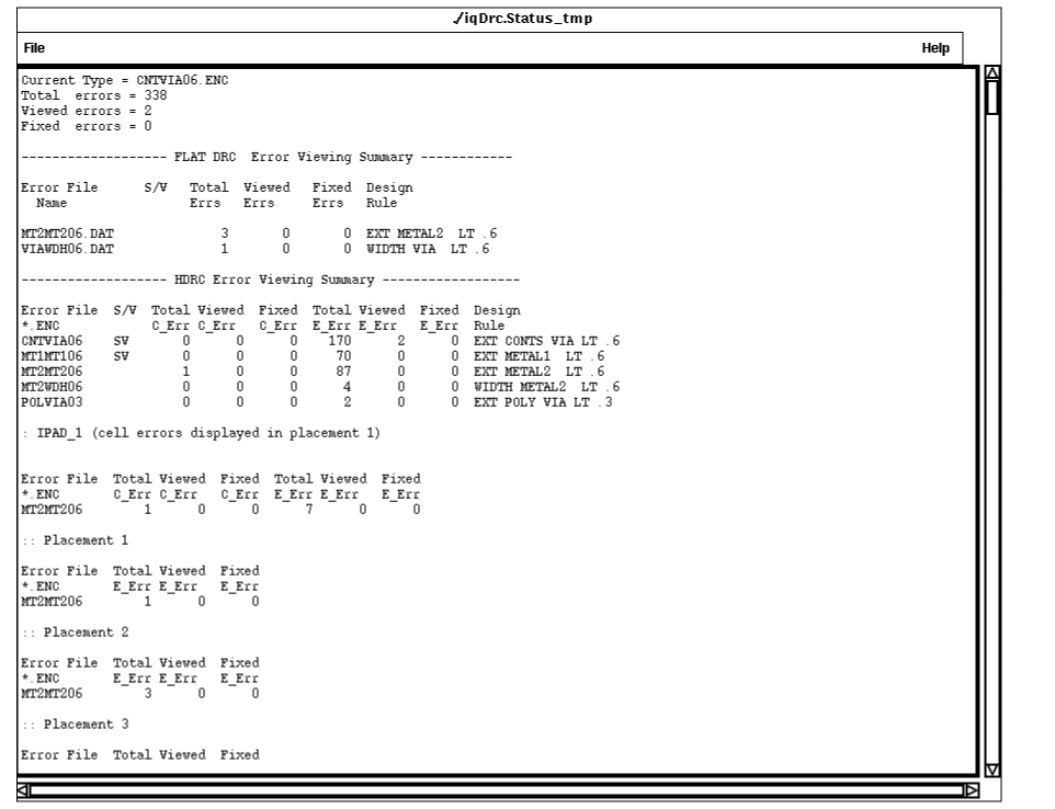 To keep track of all the errors that resulted from your hierarchical DRC run, you use the error status report. This report is a text file that provides information about all the errors that resulted from your hierarchical DRC run.