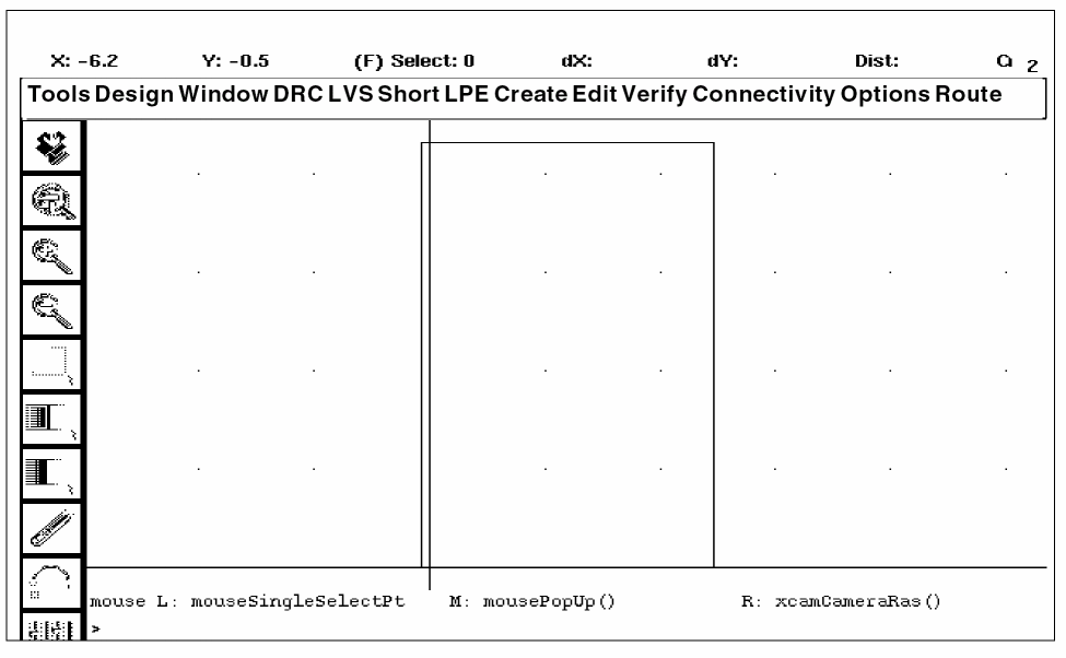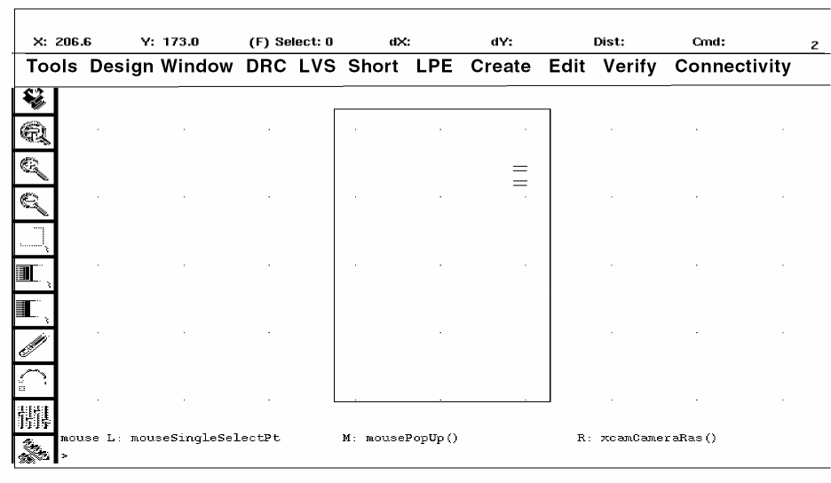 After you open the empty cell, the graphical user interface window appears. The graphical user interface window and the Layer Selection Window (LSW) are the only two windows open. You can ignore the LSW for now.
