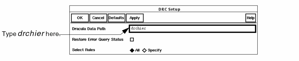 To tell graphical user interface where to find your Dracula DRC files, in the Dracula Data Path field, type drchier.