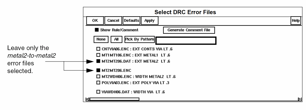 Next you’ll learn how to tell the graphical user interface which files to display. For this section, you’ll need to select the files with metal2-to-metal2 errors.