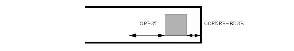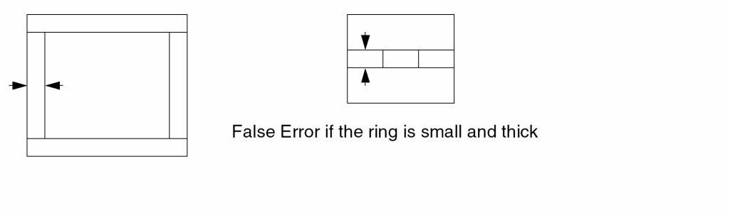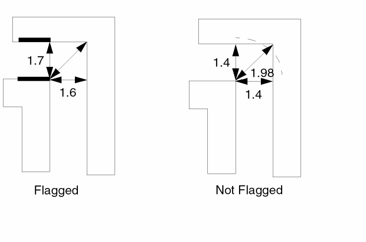 Flags an error if the two segments are spaced less than n2 and greater than n1. If you do not want acute-angle error flags, you must specify the RANGE measurement.