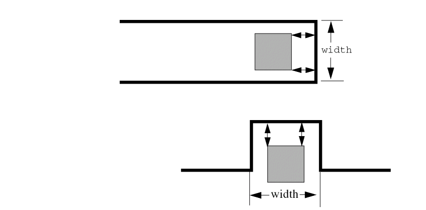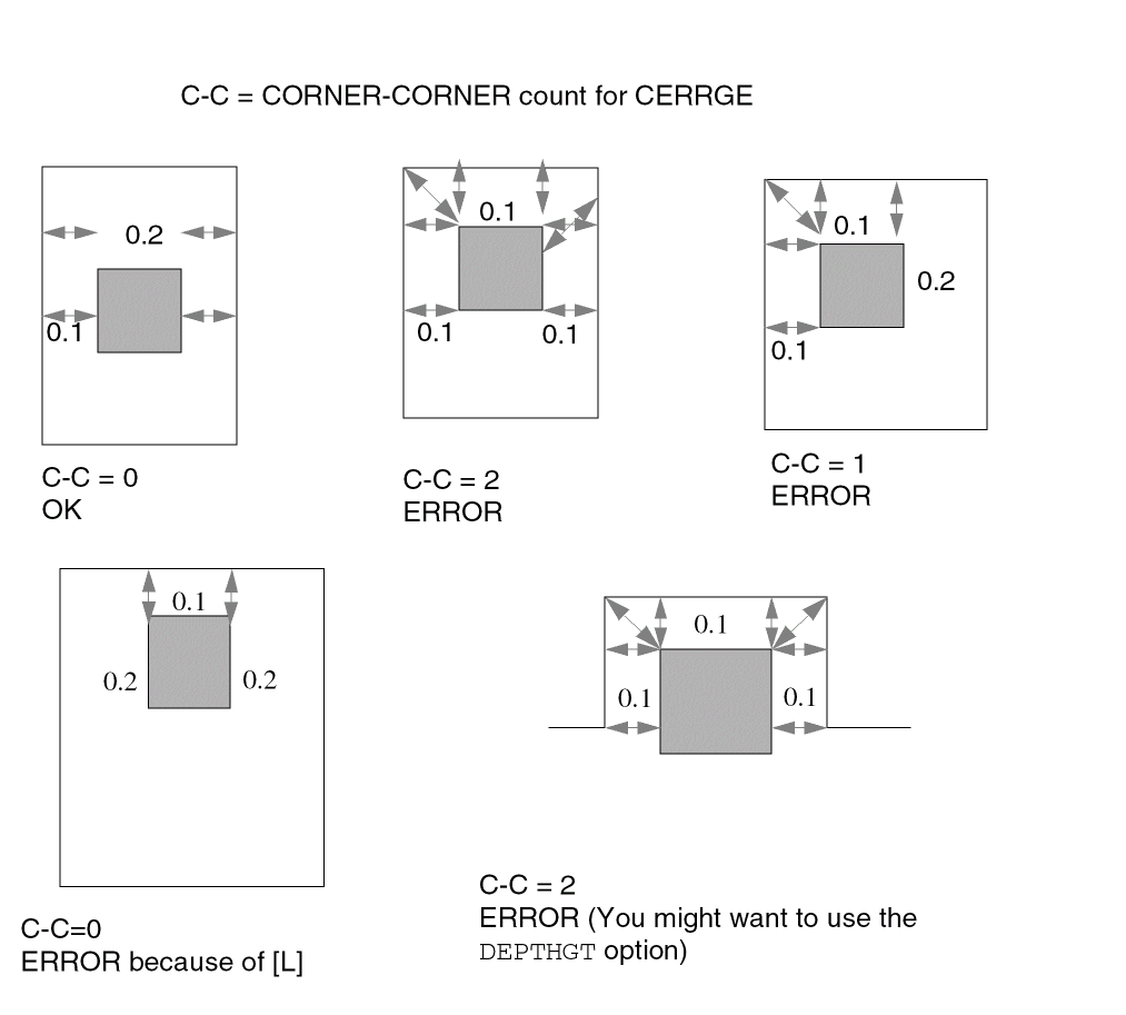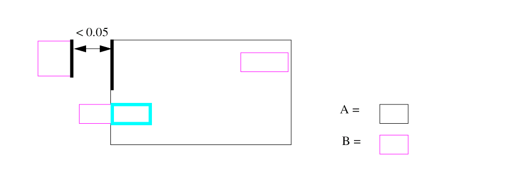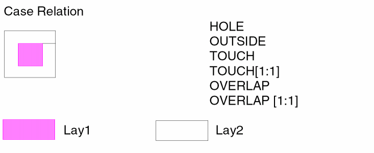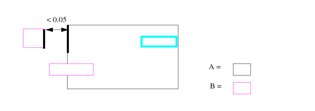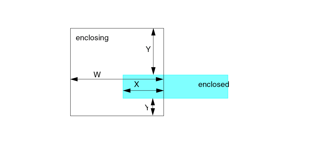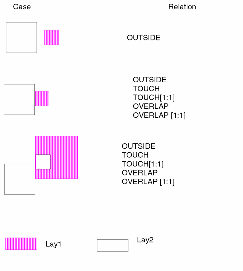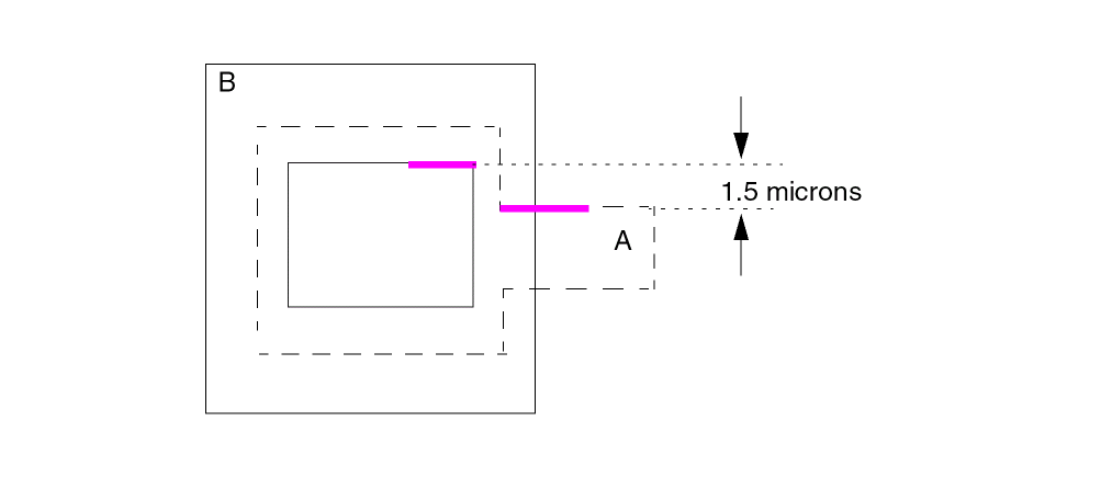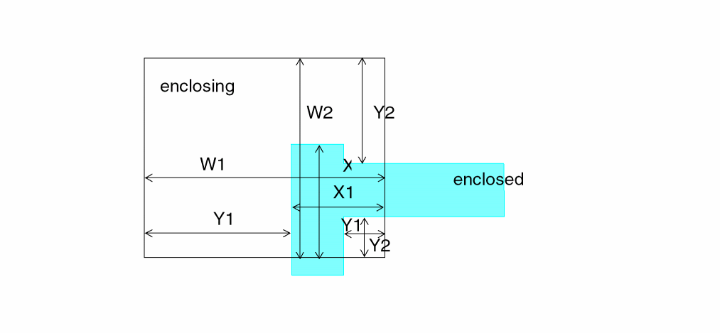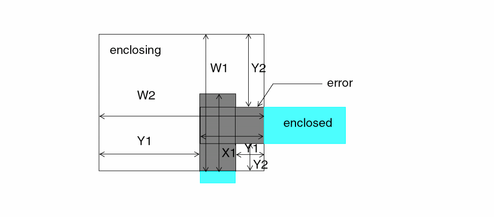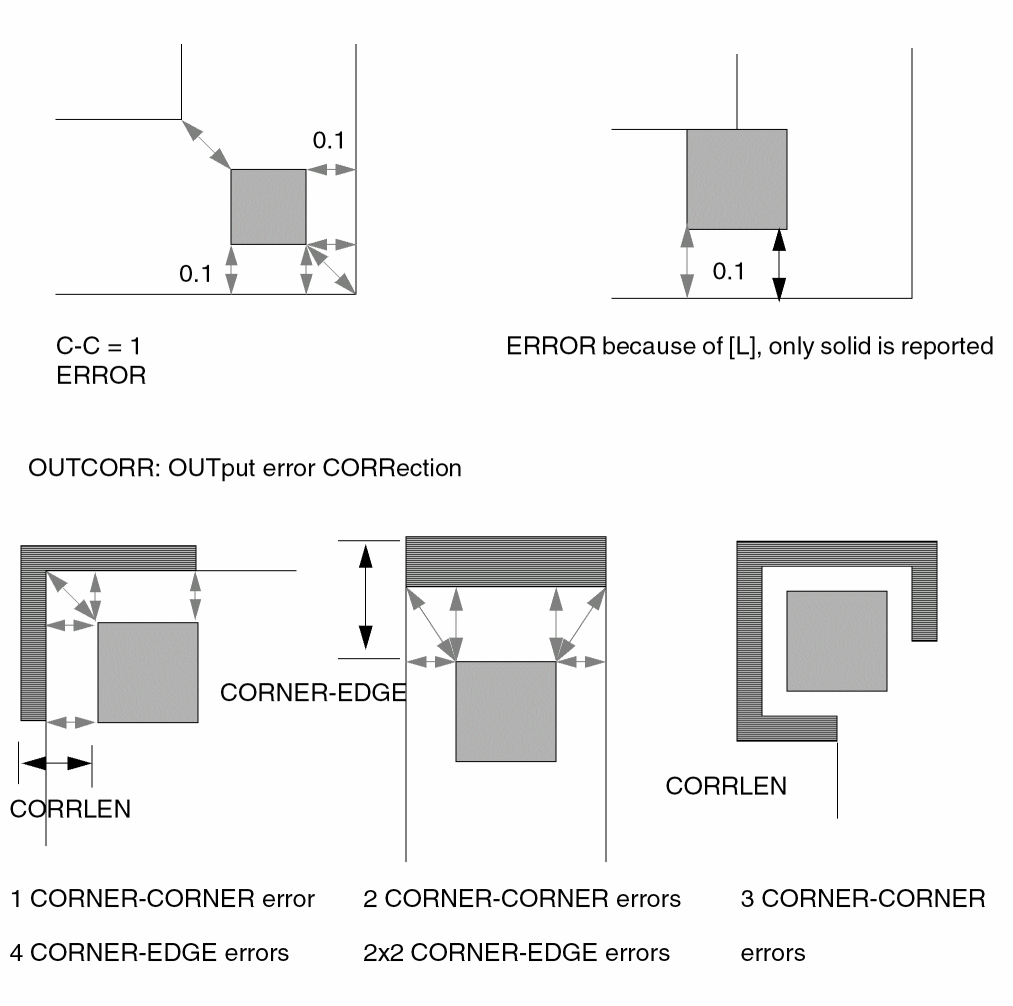 The spacing operations check geometric spacing and sizing on polygons in original and created layers and flag the errors. You can further process these errors using either conjunctive rules, the R option, or the R' option.