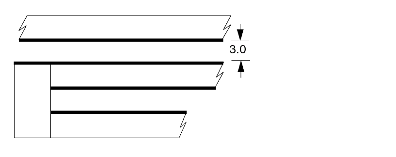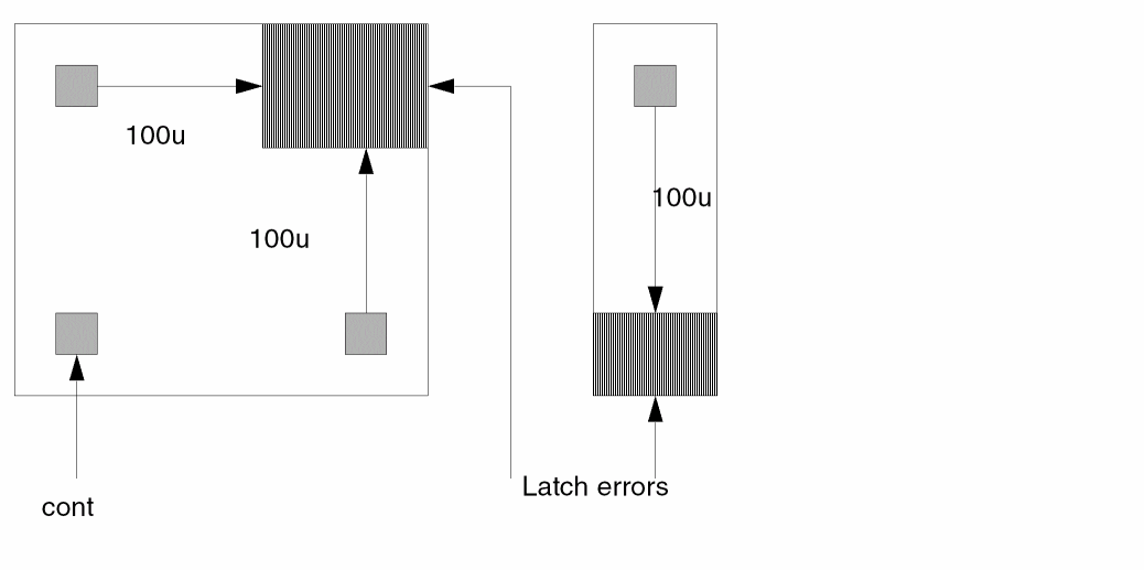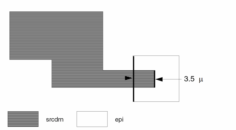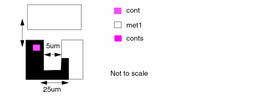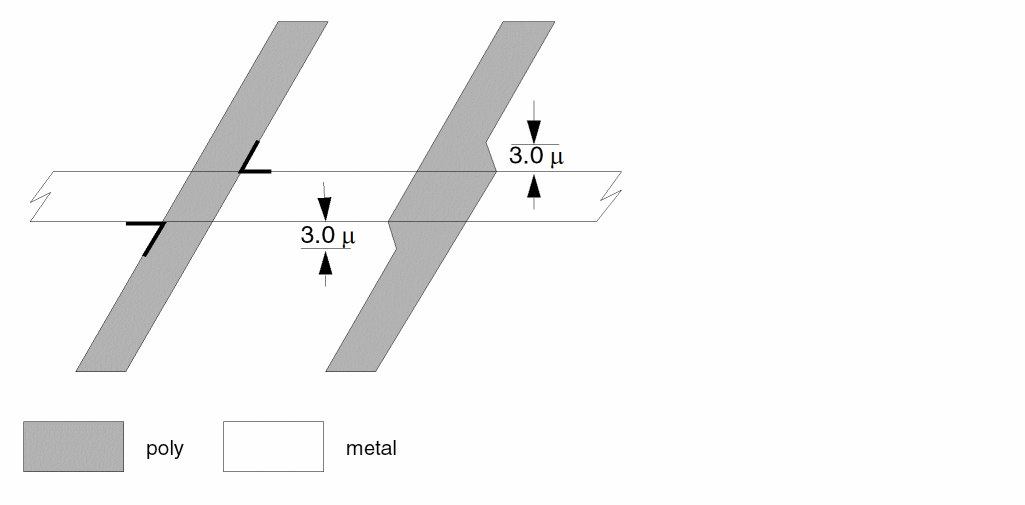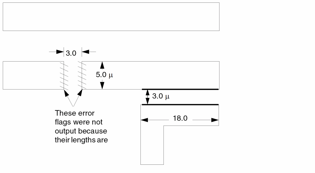 This example checks for external metal spacing of 5.0 microns of metal lines that are 4.0 microns wide. These narrow metal lines must be spaced at 5.0 microns and not at 4.0 microns for wider busses.