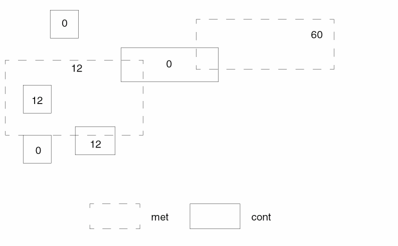 In the figure, numbers 12 and 60 are internal node numbers of layer met, and 0 represents either a no stamped node number or a conflicting node number.