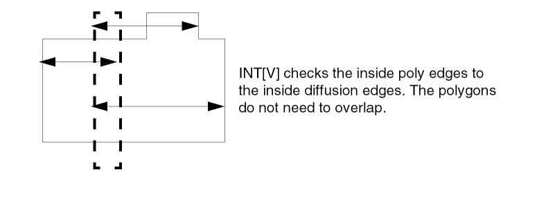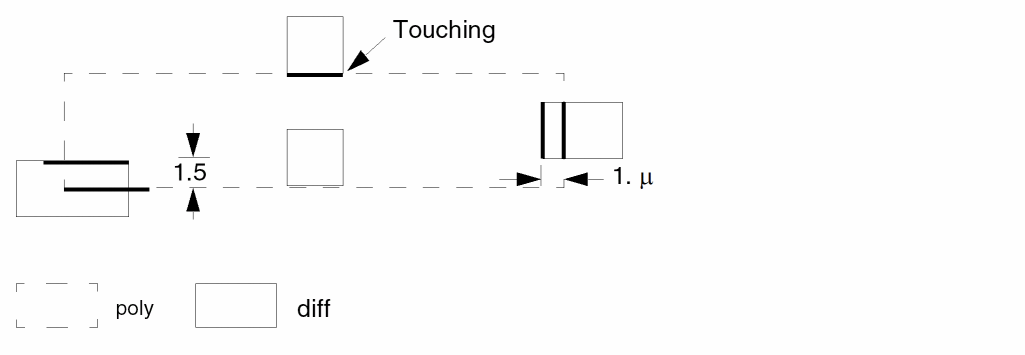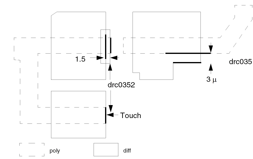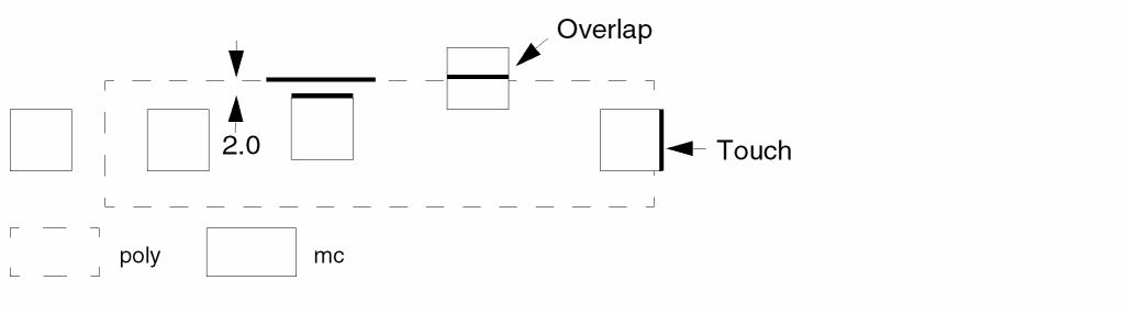 The first three command lines check for transistor channel length of less than 3 microns. The fourth command checks for gate external spacing to contact (mc) in the direction of diffusion only. Touching is also an error.