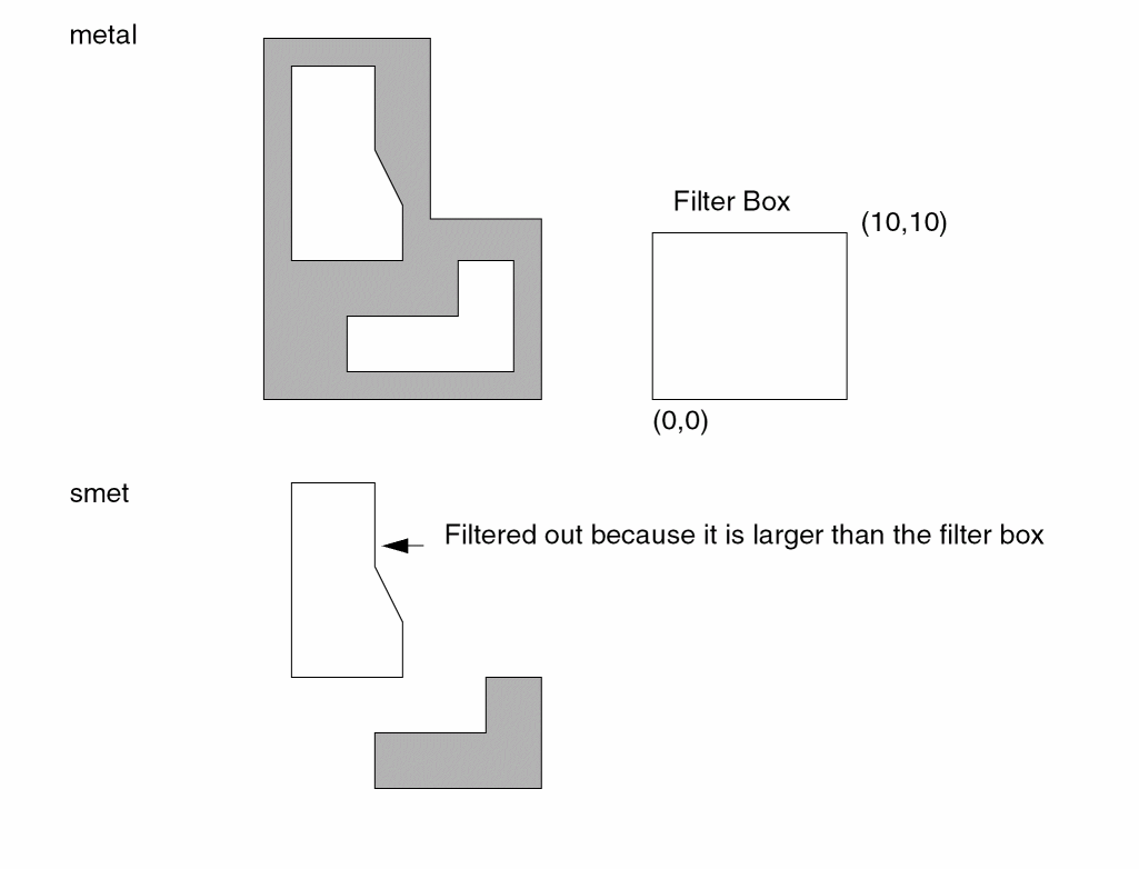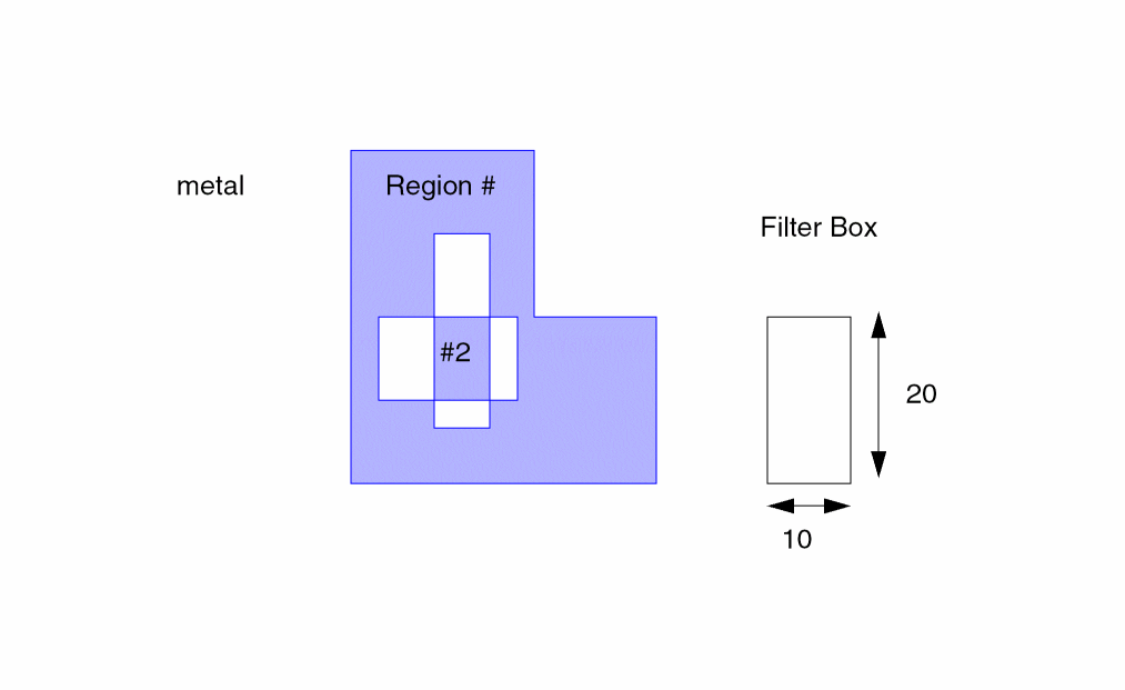 This example outputs metal polygons that have widths greater than 10 microns only. Does not output widths less than or equal to 10 microns. The output layer is wmetal and is in trapezoid format.