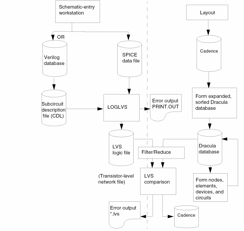 To run an LVS comparison, you must convert a schematic netlist into a transistor-level network data file. You can use LOGLVS to convert many different database formats, as shown in the LVS flow diagram on the following page.