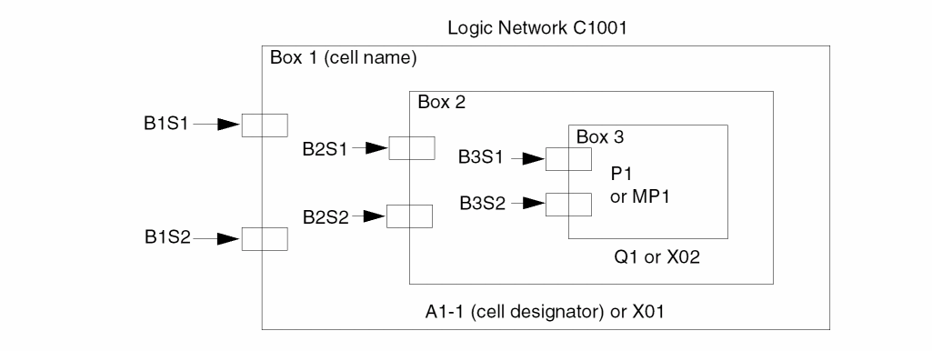 After macro expansion, each node has a new name inside the macro. LOGLVS uses the following format for a node name or cell designator in a logic-level or circuit-level network: