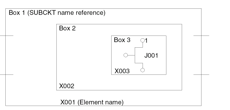 You use an empty .SUBCKT definition to define a box element. You use an empty .SUBCKT call (X2) to instantiate an instance of the element. You can specify parameters for instances of a box element. In the above example, nr, rad, w, and s are parameters.