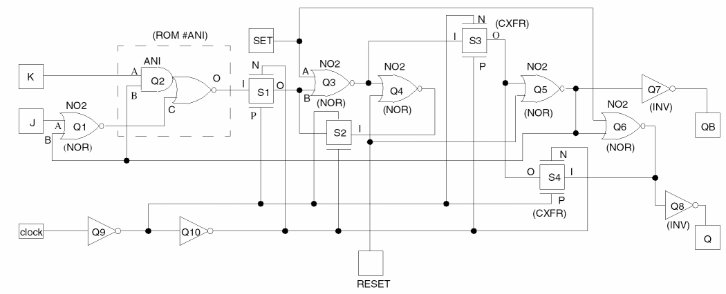 This section shows an example of a dual CMOS JK flip-flop. The following figure shows the schematic diagram of the JK flip-flop at the transistor level. The figures on the following pages show the same network redrawn at the logic level and transistor level implementation of cells. The network is composed of two identical flip-flops with only power and ground in common.
