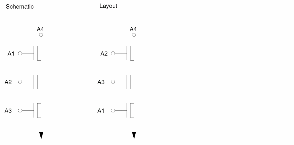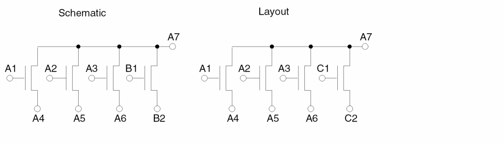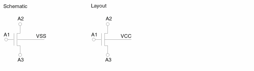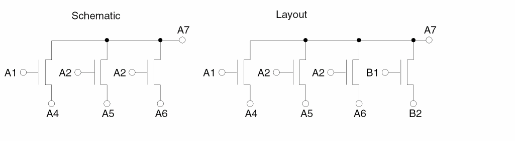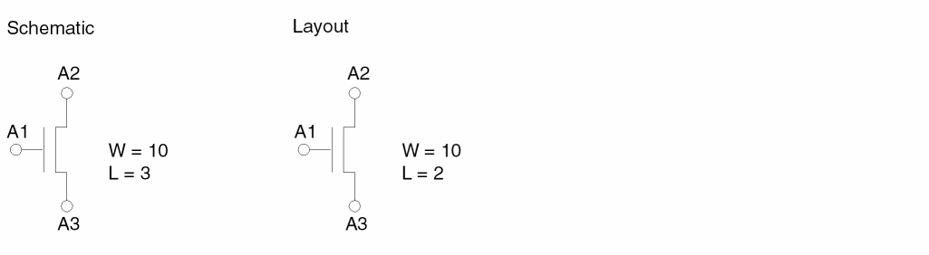 In addition, LVL compares device subtypes and certain device parameters, such as the channel width and length of MOS devices.