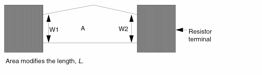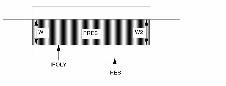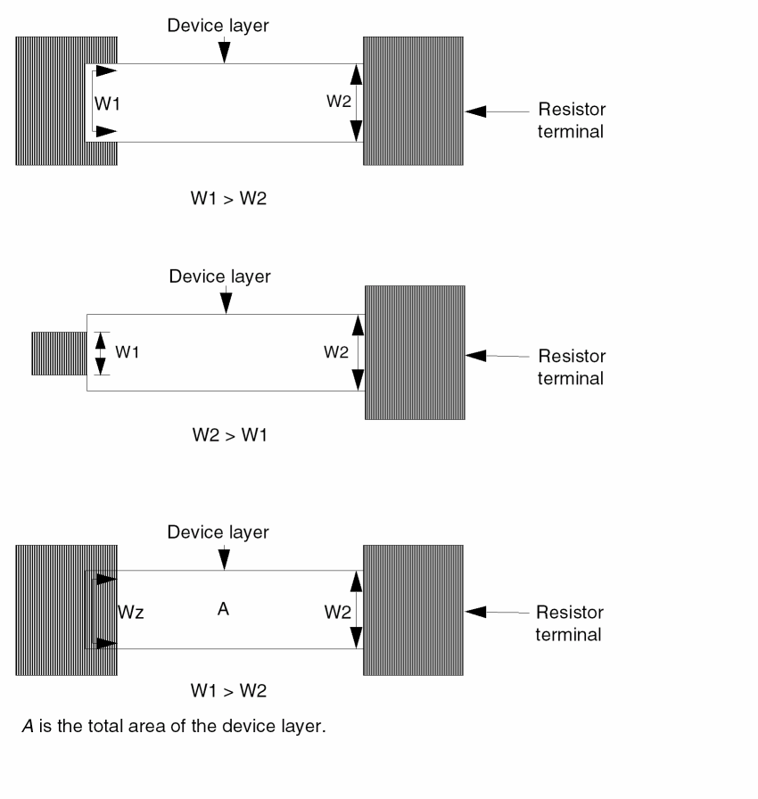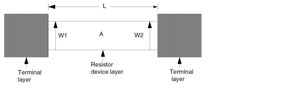 To define effective width, device size extraction uses the device layer where it touches terminals W1 and W2. Device size extraction uses area and effective width to compute the effective length of the resistor. You must properly size or logically create the terminal layer to ensure the correct resistance value.