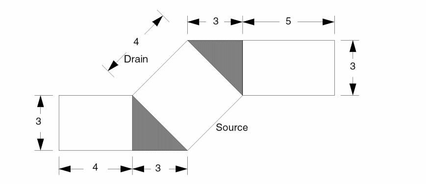 The transistor widths to the source and drain are the MOS transistor gate perimeters that touch or overlap the diffusion area. The average of the transistor widths at source and drain is the width for the gate area. The transistor length is the ratio of the total gate area to the average of the widths at source and drain.