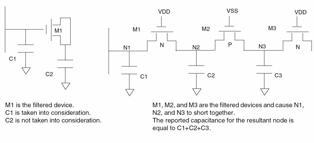 With device filtering on, if a filtered device has one terminal connected to one net of the circuit after filtering, the capacitance of the filtered device, which is related to the net, is taken into consideration. All parasitic capacitance related to the merged nodes is added to the resultant node. The following illustration shows how LPE handles filtered devices.