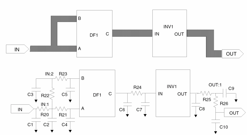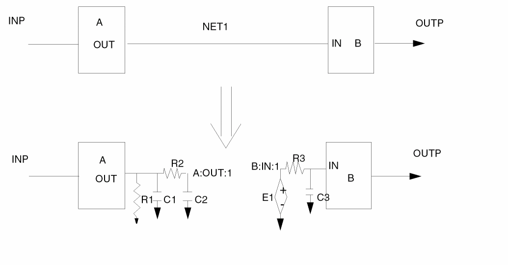 .SUBCKT MODULE2 OUTP INP *|GROUND_NET VSS * *Net Section * . . . *|NET net 5.4982PF * 1st driver pin group *|DRIVER A:OUT A OUT *|S (A:OUT:1) R1 ... R2 ... C1 ... C2 ... *|LOAD C:IN C IN *|S (C:IN:1) E1 ... R3 ... C3 ... *|LOAD D:IN D IN *|S (D:IN:1) E2 ... R4 ... C4 ... * 2nd driver pin group *|DRIVER B:OUT B OUT *|S (B:OUT:1) R5 ... R6 ... C5 ... C6 ... *|LOAD C:IN C IN *|S (C:IN:1) E3 ... R7 ... C7 ... *|LOAD D:IN D IN *|S (D:IN:1) E4 ... R8 ... C8 ... * *|NET next_net 1.9387PF . . . * *Instance Section * . . . XA ... XB ... XC ... XD .... . . .ENDS