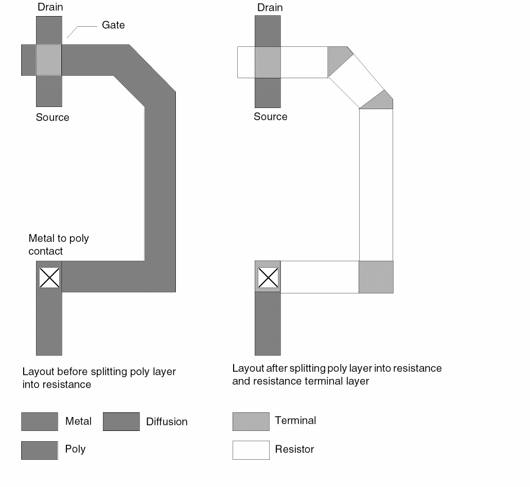 For more details about splitting the resistance and resistance terminal layers, refer to the section “Creating the Resistor and Resistor Terminal Layers”.