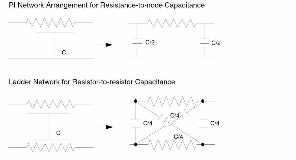 - Pi (π) and ladder distribution of coupling and fringe capacitances involving parasitic resistor layers