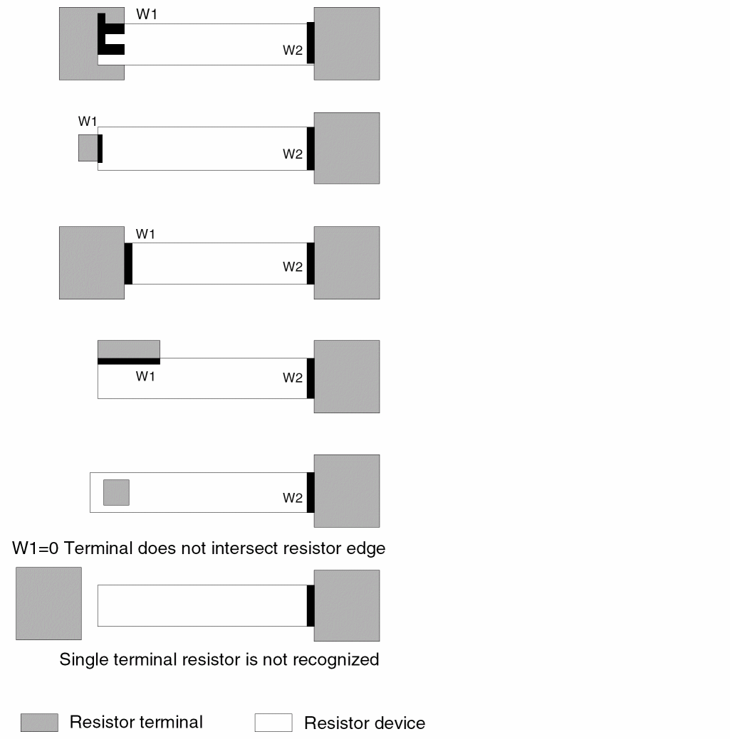 - Rectangles or polygons corresponding to resistor terminal regions. Resistor terminal regions act as conduction layer nodes that connect together the two-terminal parasitic resistors and other devices.