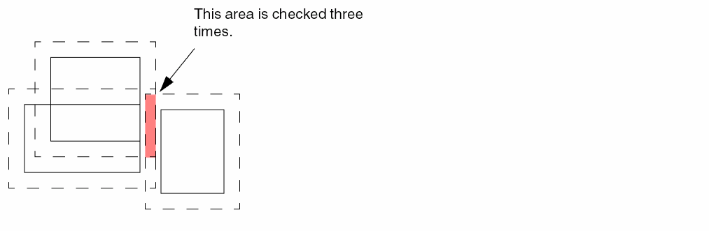 You can minimize redundant checking by avoiding Hcell overlaps. Dracula sets up Hcells by creating an environment area around them that is as wide as the largest spacing check on hierarchical layers in the Operations block. When Hcells overlap, their environments also overlap. Because Dracula checks the environment of each Hcell, Dracula checks certain overlapping environment areas many times.