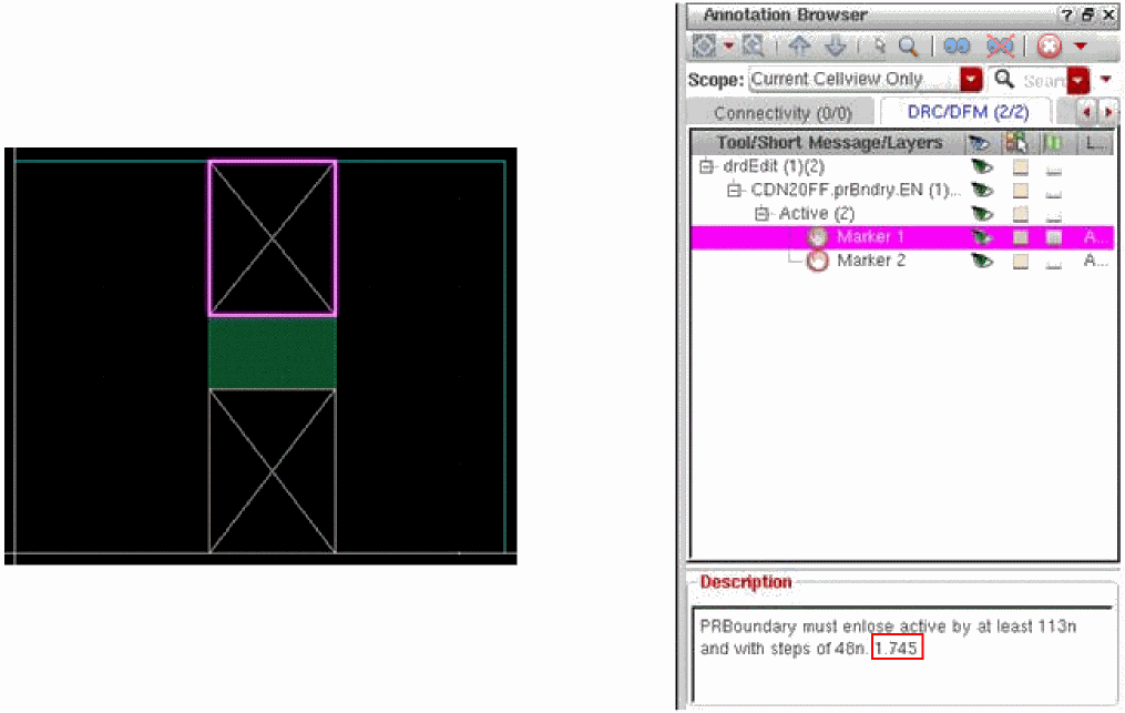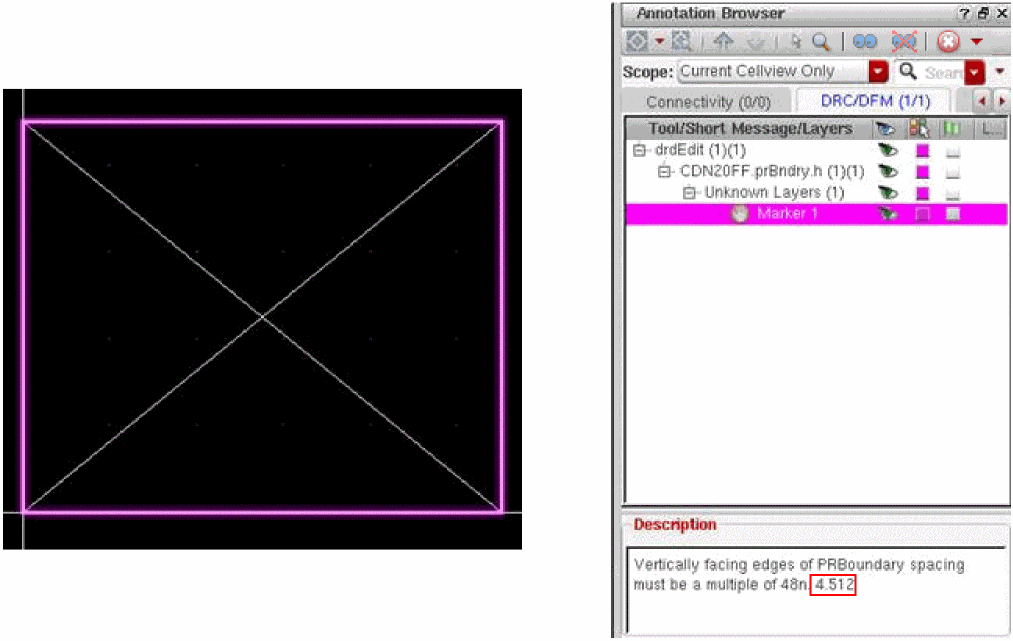 The following figure illustrates this example in DRD Post-Edit and Batch-Check modes. As shown in the Annotation Browser, DRD reports an allowedPRBoundaryDimensions violation (Marker 1) because the vertical dimension of the PR boundary does not conform to the nearest legal width value (4.512 user units).