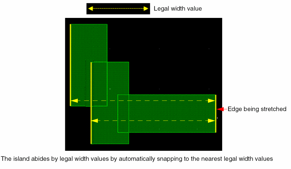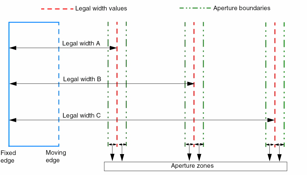 Each legal width value is surrounded by aperture boundaries, which form an aperture zone. An aperture zone is the snap distance between the pointer, or the moving edge of the rectangle, and the legal width value.